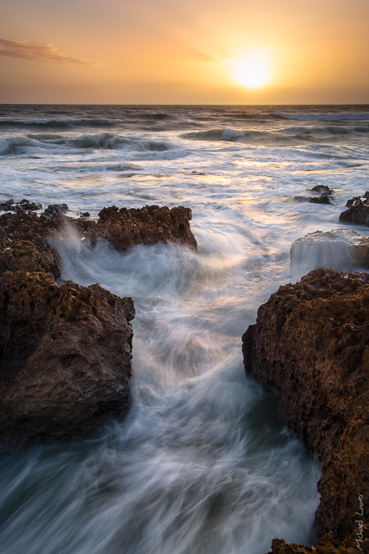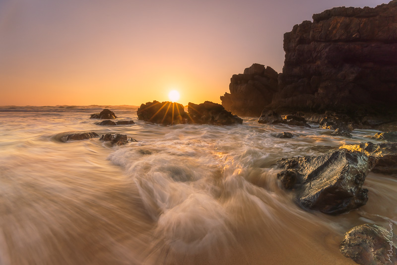 Die Strände von Sintra sind eine Abendlocation. Die Flüge, die ich gewöhnlich nach Lissabon nehme, landen meist am späten Vormittag oder gegen Mittag. Somit bleibt genug Zeit, sich den Abend nach dem Wetter zurecht zu legen und einen Strand auszuwählen auf den man Lust hat und für den das Licht hoffentlich passt. Für diesen Abend zeichnete sich eine Wetterlage ab, die man als eine Mischung zwischen “undankbar” und “herausfordernd” bezeichnen konnte: Ca. 2km vor der Küste lag ein Dunstband über dem Meer, das beim direkten Blick zur Sonne alles milchig erscheinen lies. Es war also nichts mit klarem Horizont oder gar Wolken, die nach Sonnenuntergang ein Glühen versprachen. Was blieb, war recht warmes, beinahe indirektes Licht. Wir beschlossen daher die Küstenlinie selbst zum Motiv zu machen und das geht in Sintra mit am besten vom Praia do Magoito aus.