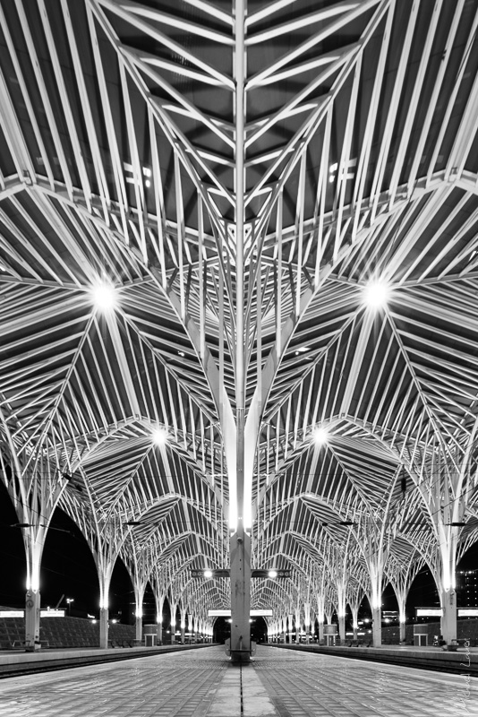 Ein s/w-Umsetzung unterstreicht die grafischen Strukturen am Bahnhof Lisboa Oriente.