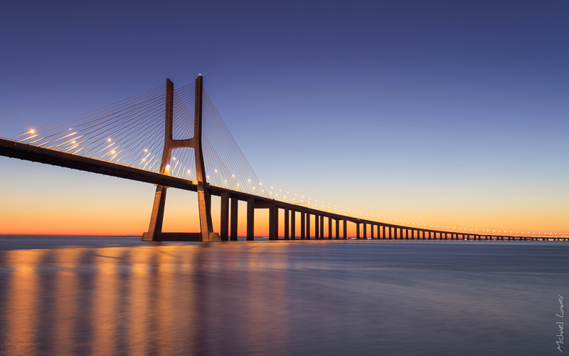 Zu einem Aufenthalt bei Sintra gehört auch meist ein fotografischer Abstecher nach Lissabon. Schließlich hat Lissabon hier einiges zu bieten. Der Bereich um das Expo-Gelände ist architektonisch sehr interessant. Der Bahnhof Lisboa Oriente mit seiner imprägnanten Architektur stand schon längere Zeit auf meiner Liste und diesmal hatte ich dann auch endlich die Zeit für einen Besuch. Zum Sonnenaufgang ist es die Ponte Vasco da Gama, die mich dort immer wieder anzieht. Oft bin ich gerne lange vor Sonnenaufgang vor Ort um zu erleben, wie sich aus der Dämmerung heraus das Licht entwickelt. Das hat sich auch hier ausgezahlt, denn es gibt zu Beginn der Dämmerung ein kleines Zeitfenster von vielleicht vier Minuten, in dem die Beleuchtung der Brücke in absolut perfekter Balance mit dem Umgebungslicht ist.